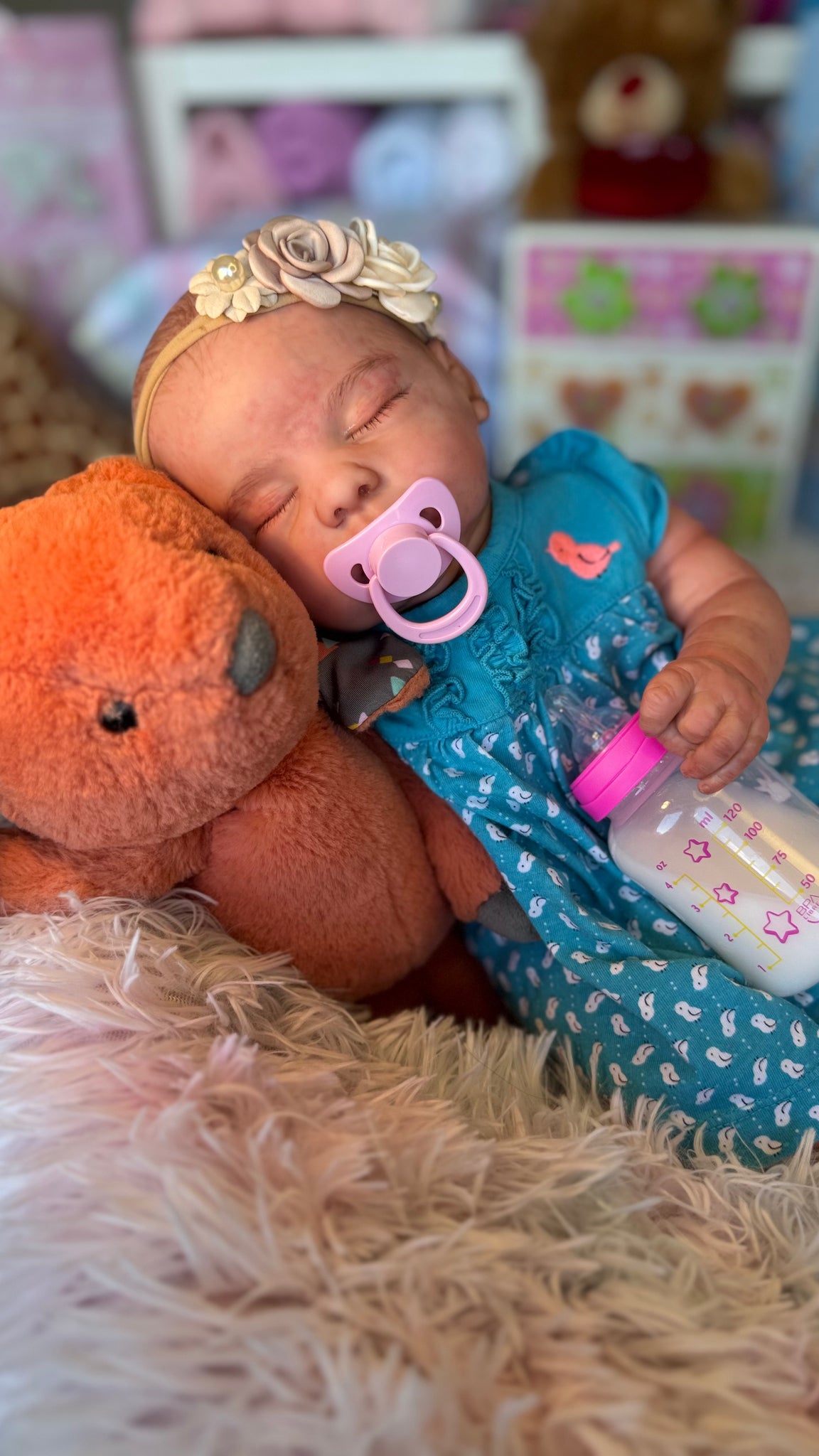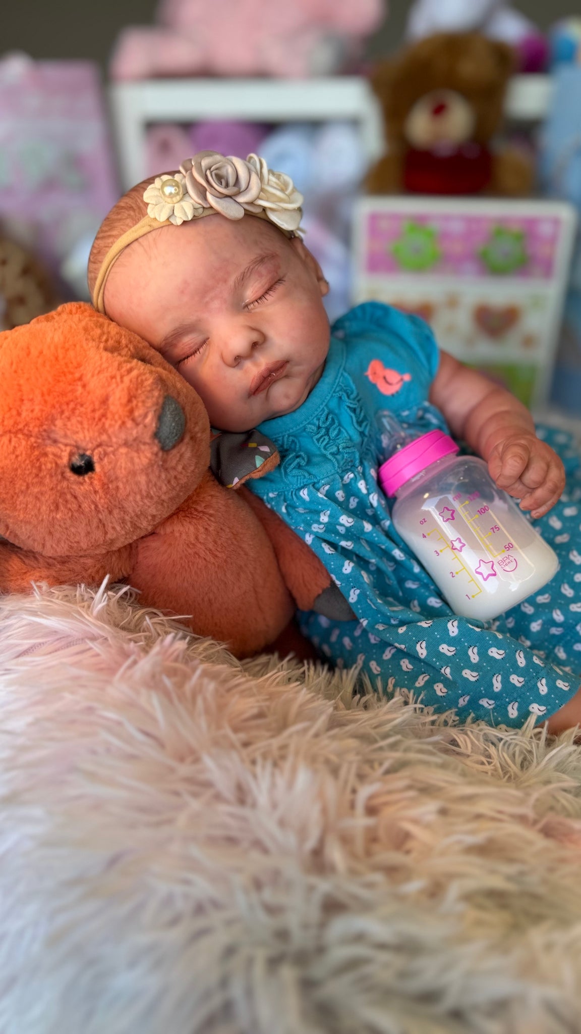 Kit reborn importado original, elaboración artesanal, discos de movimientos en brazos y piernas, relleno con microesfera de vidrio, pellet y relleno sintético, detallado con diferentes tipos de capas de pintura translucida horneable; enfatizando detalles como pliegues, uñas, cejas, labios, venas, ojos dientes, cabello y manchas propias de los bebes recién nacidos para lograr una textura en la piel lo mas parecido a lo real.
