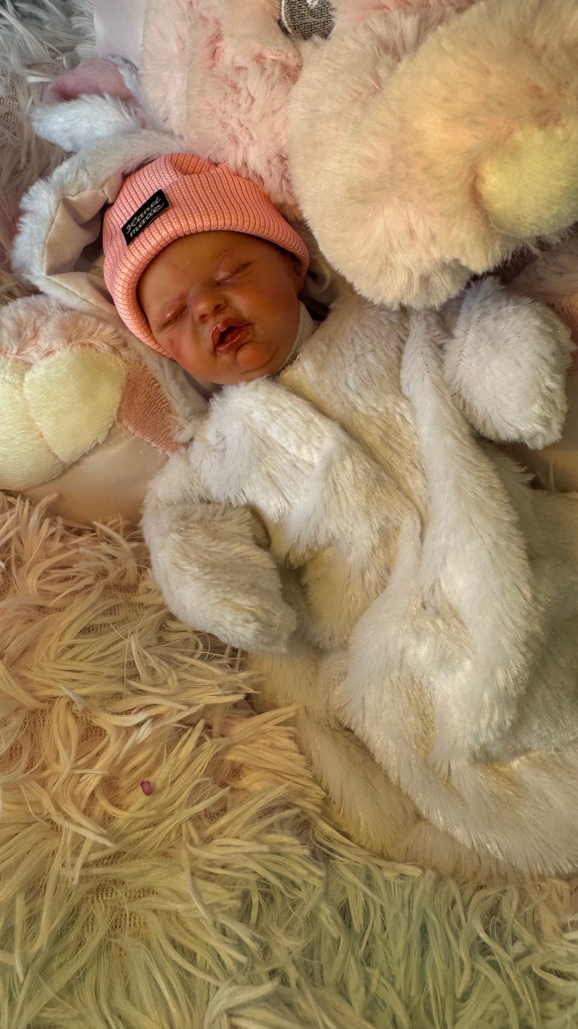 Kit reborn importado original, elaboración artesanal, discos de movimientos en brazos y piernas, relleno con microesfera de vidrio, pellet y relleno sintético, detallado con diferentes tipos de capas de pintura translucida horneable; enfatizando detalles como pliegues, uñas, cejas, labios, venas, ojos dientes, cabello y manchas propias de los bebes recién nacidos para lograr una textura en la piel lo mas parecido a lo real.