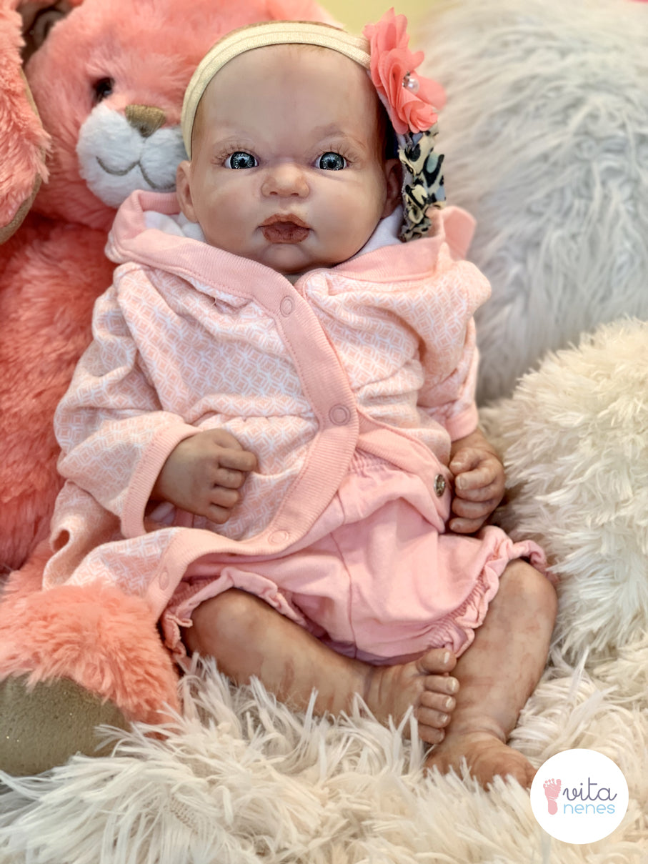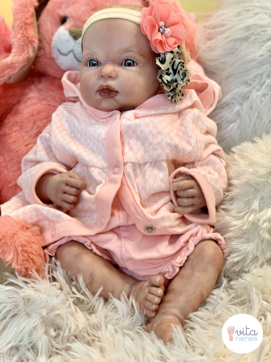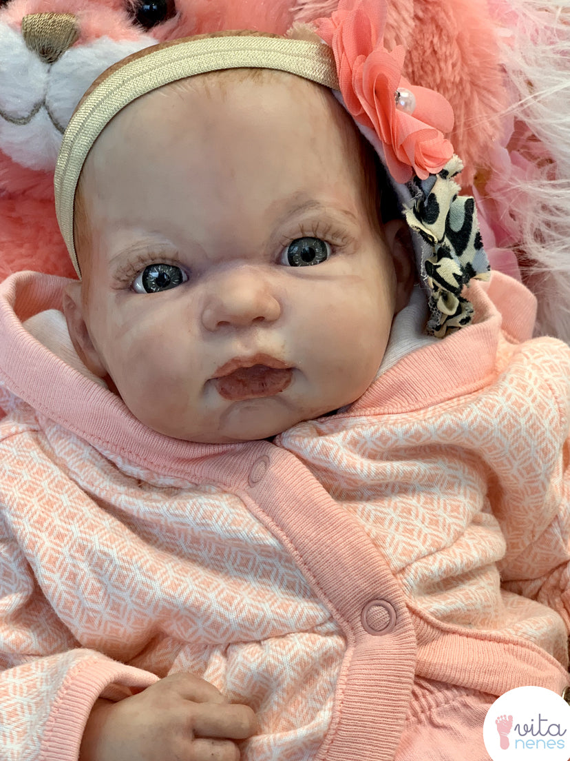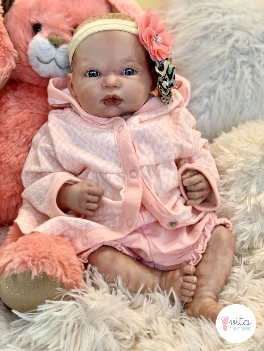 Kit reborn importado original, elaboración artesanal, discos de movimientos en brazos y piernas, relleno con microesfera de vidrio, pellet y relleno sintético, detallado.con diferentes tipos de capas de pintura translucida horneable; enfatizando detalles como pliegues, uñas, cejas, labios, venas, ojos dientes, cabello y manchas propias de los bebes recién nacidos para lograr una textura en la piel lo mas parecido a lo real.